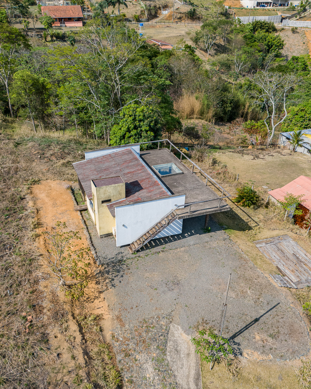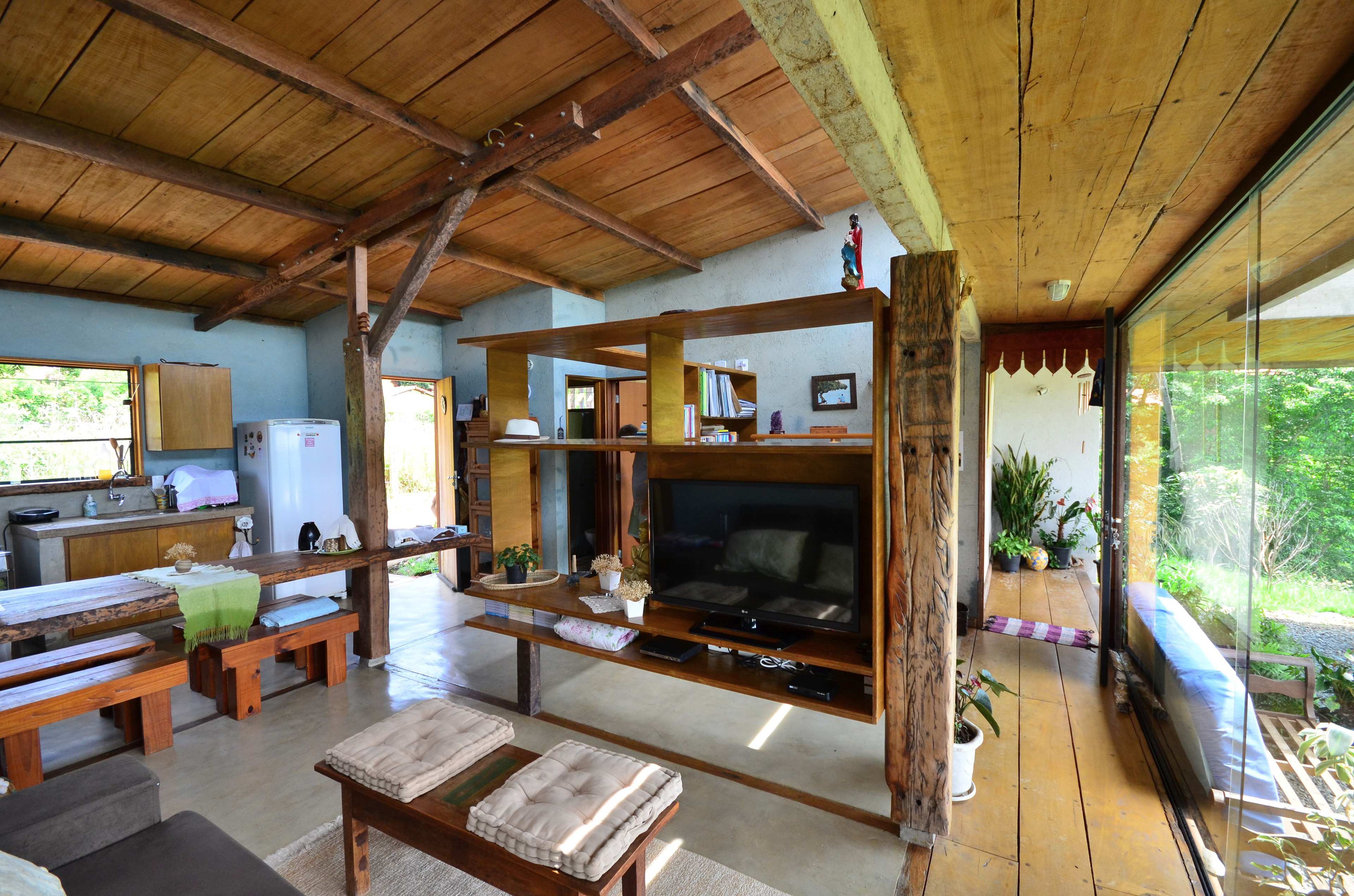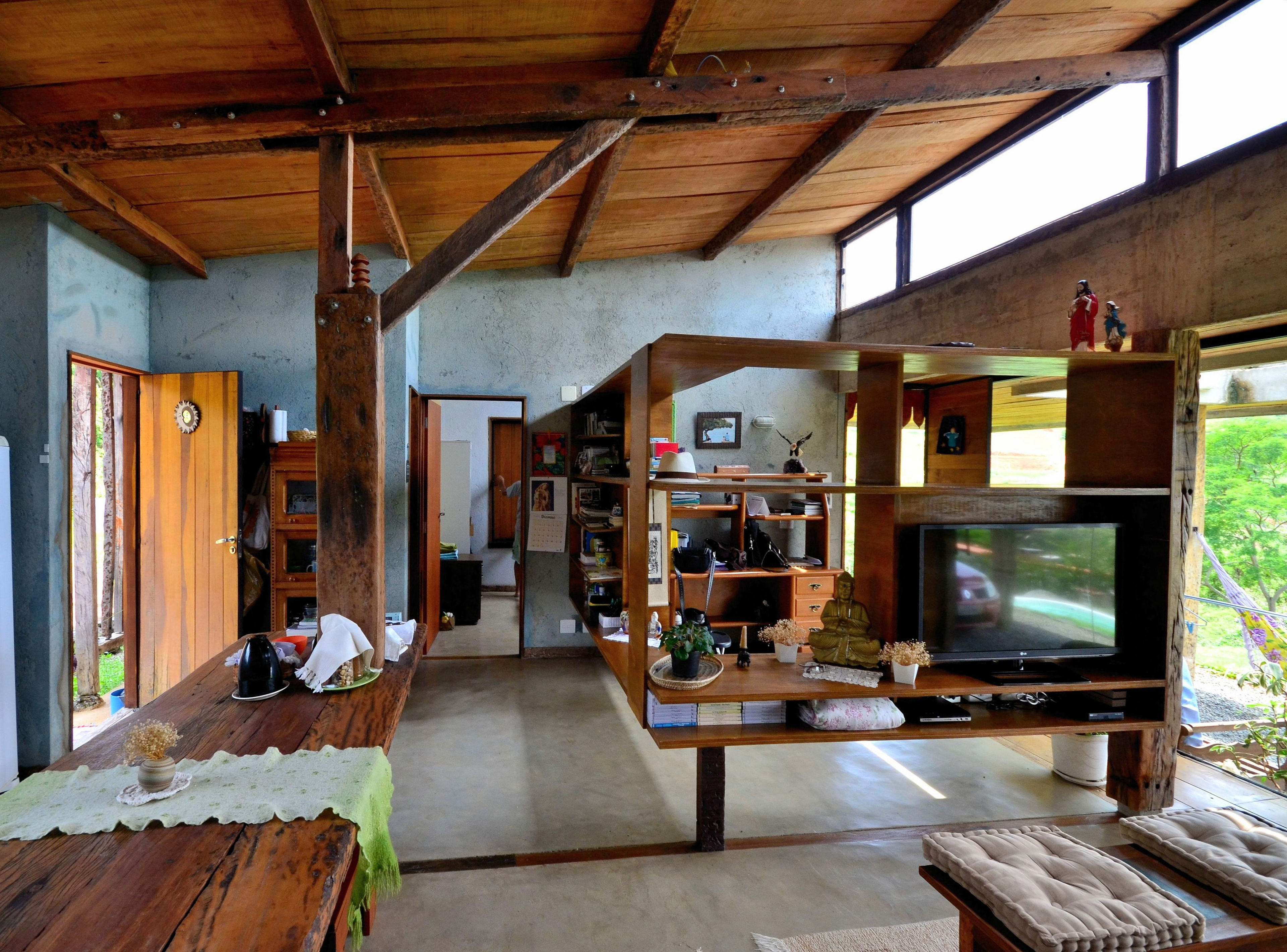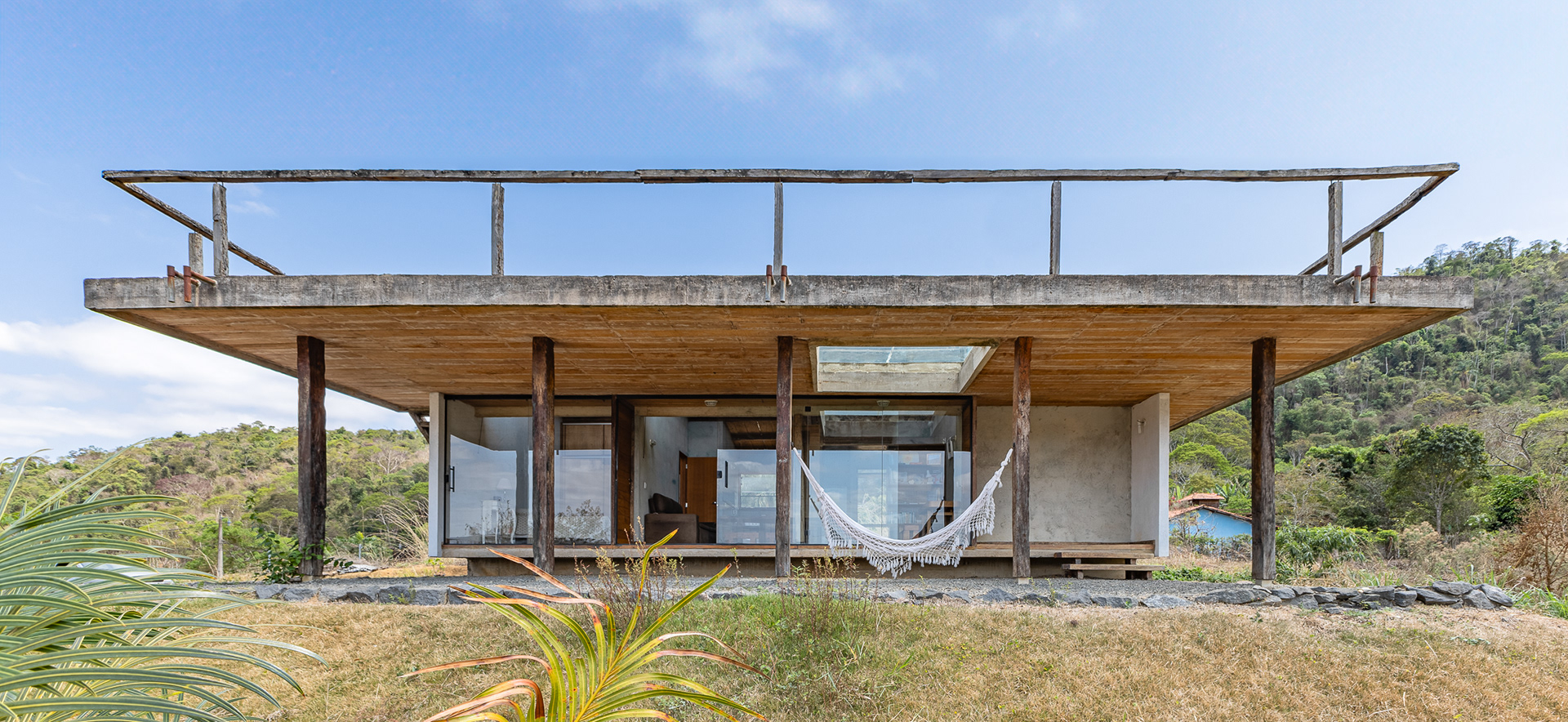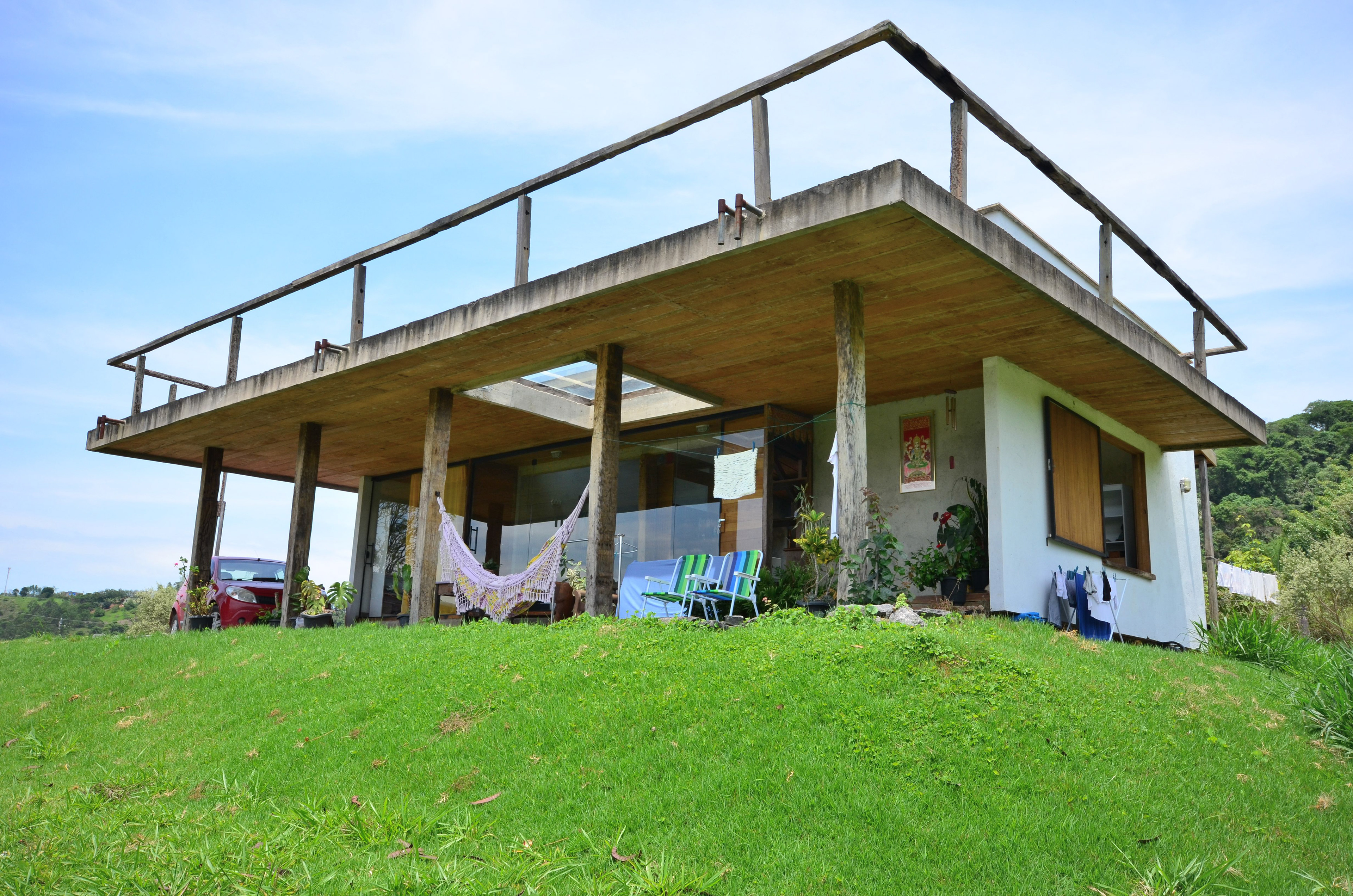 Sobre tabuados de jequitibá dois tetos distintos foram construídos: telhado para a casa e laje a gerar sua dupla extensão: varanda e terraço - espaços intermediários entre a casa e a imensidão.