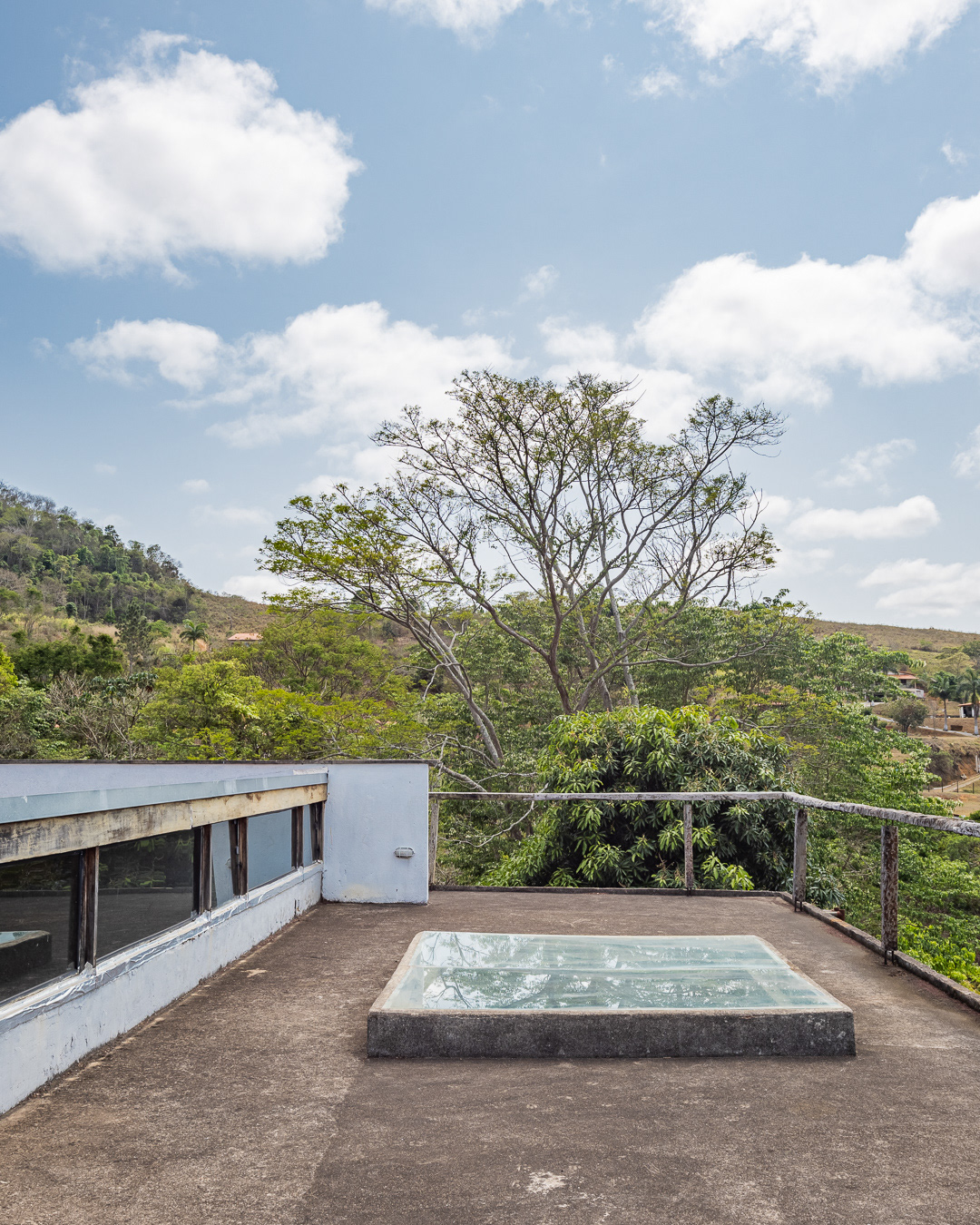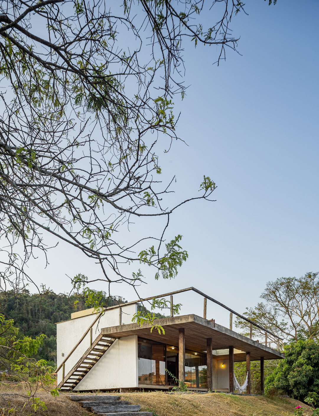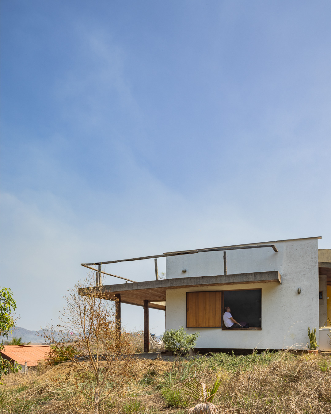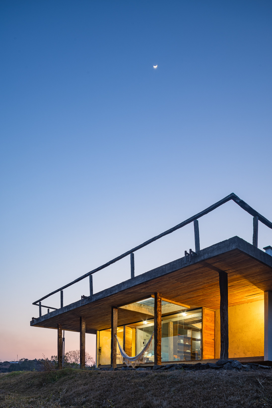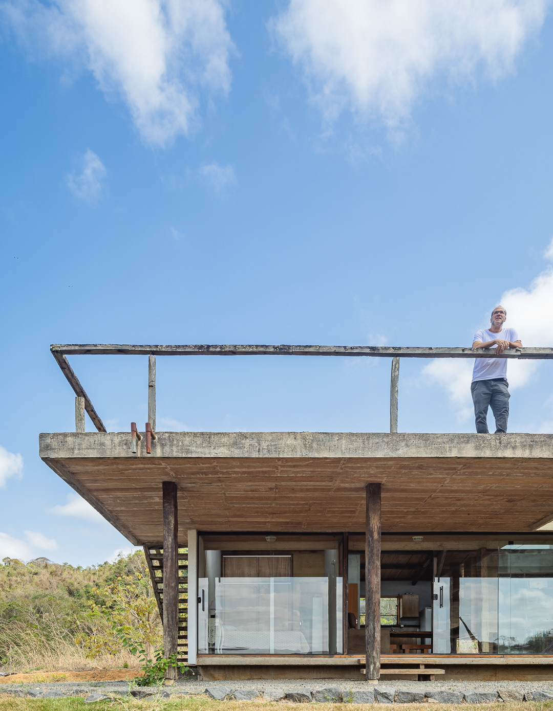 Sobre tabuados de jequitibá dois tetos distintos foram construídos: telhado para a casa e laje a gerar sua dupla extensão: varanda e terraço - espaços intermediários entre a casa e a imensidão.
