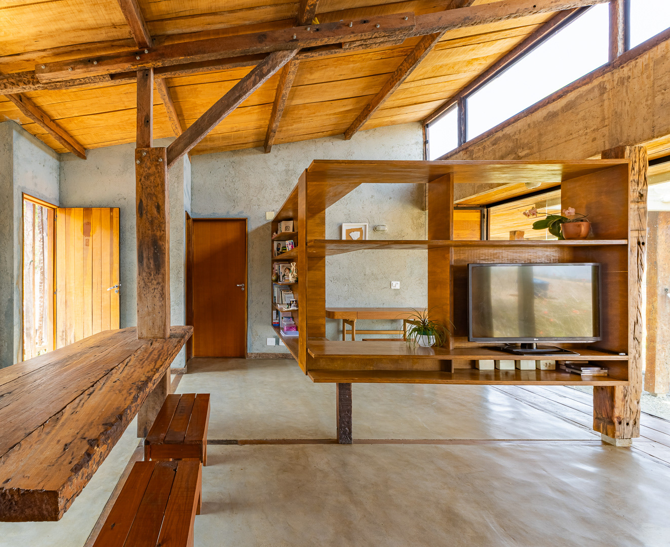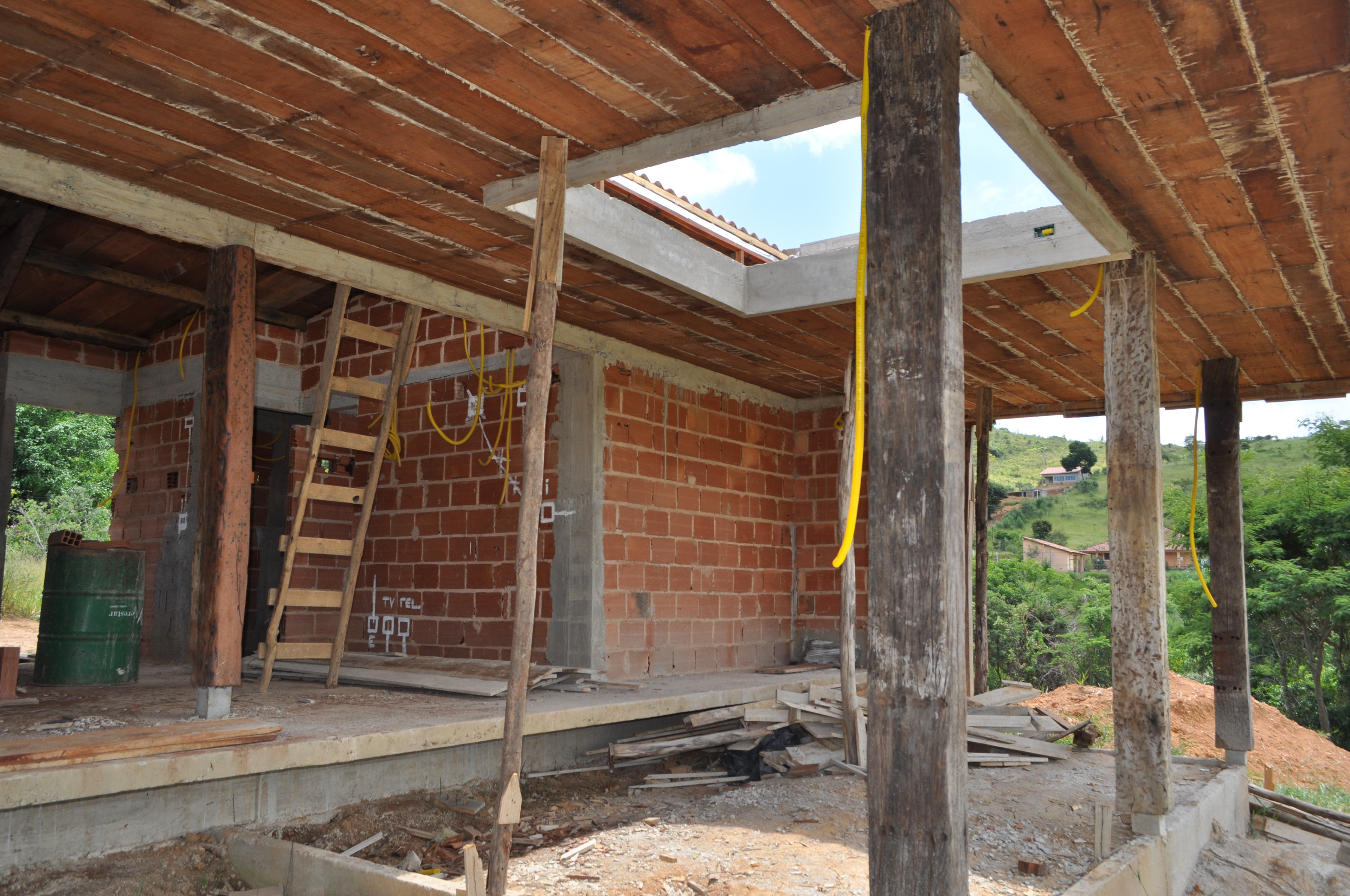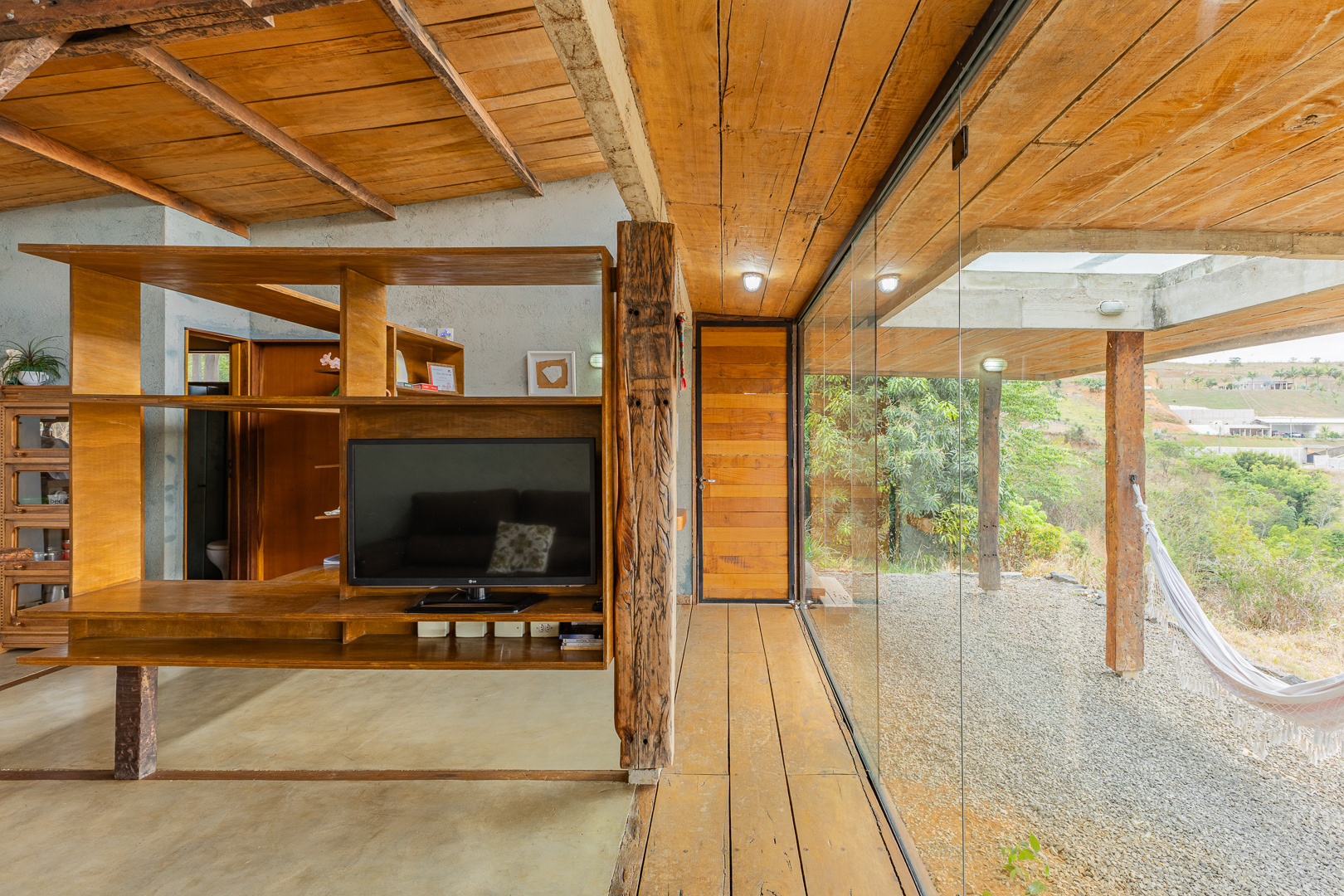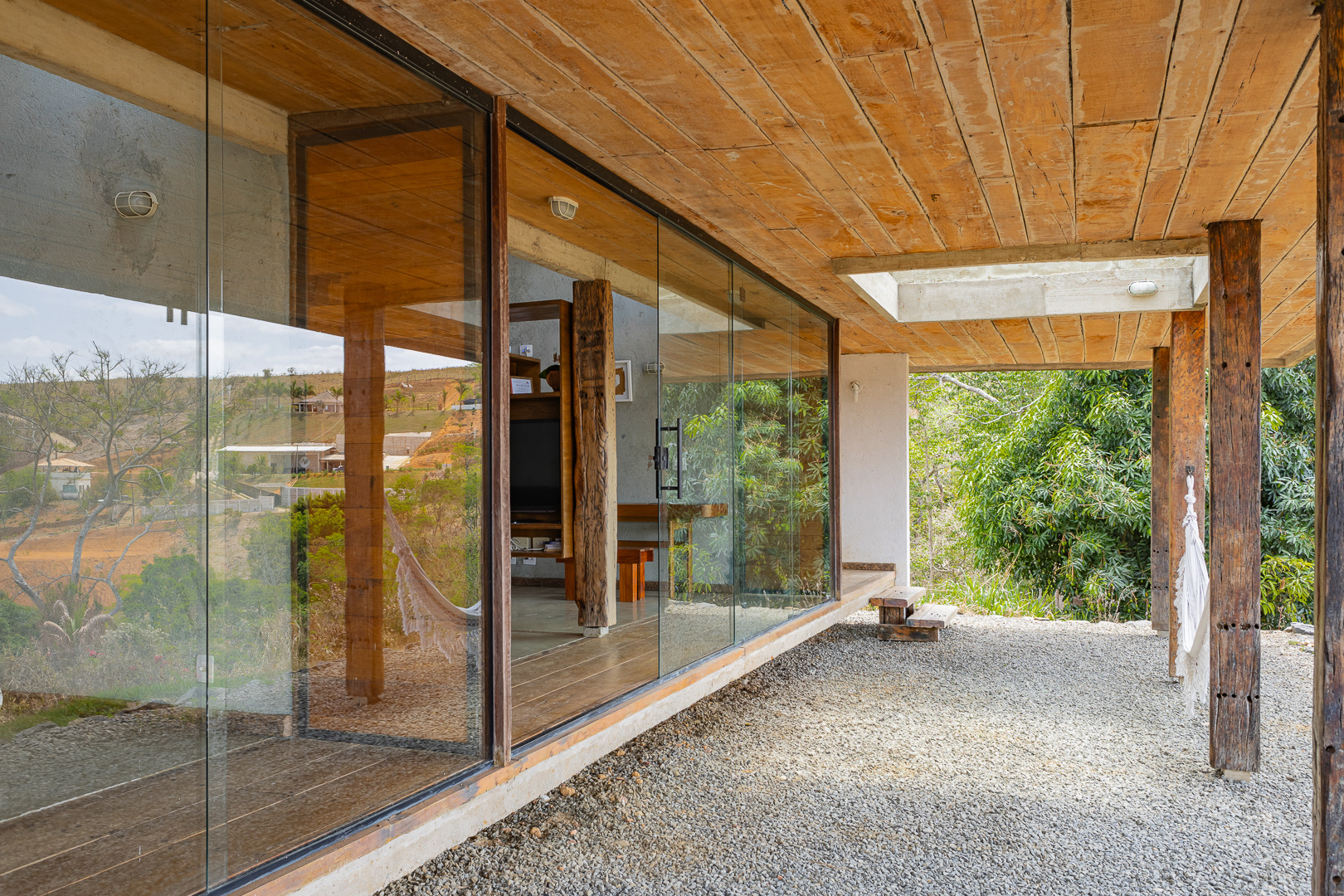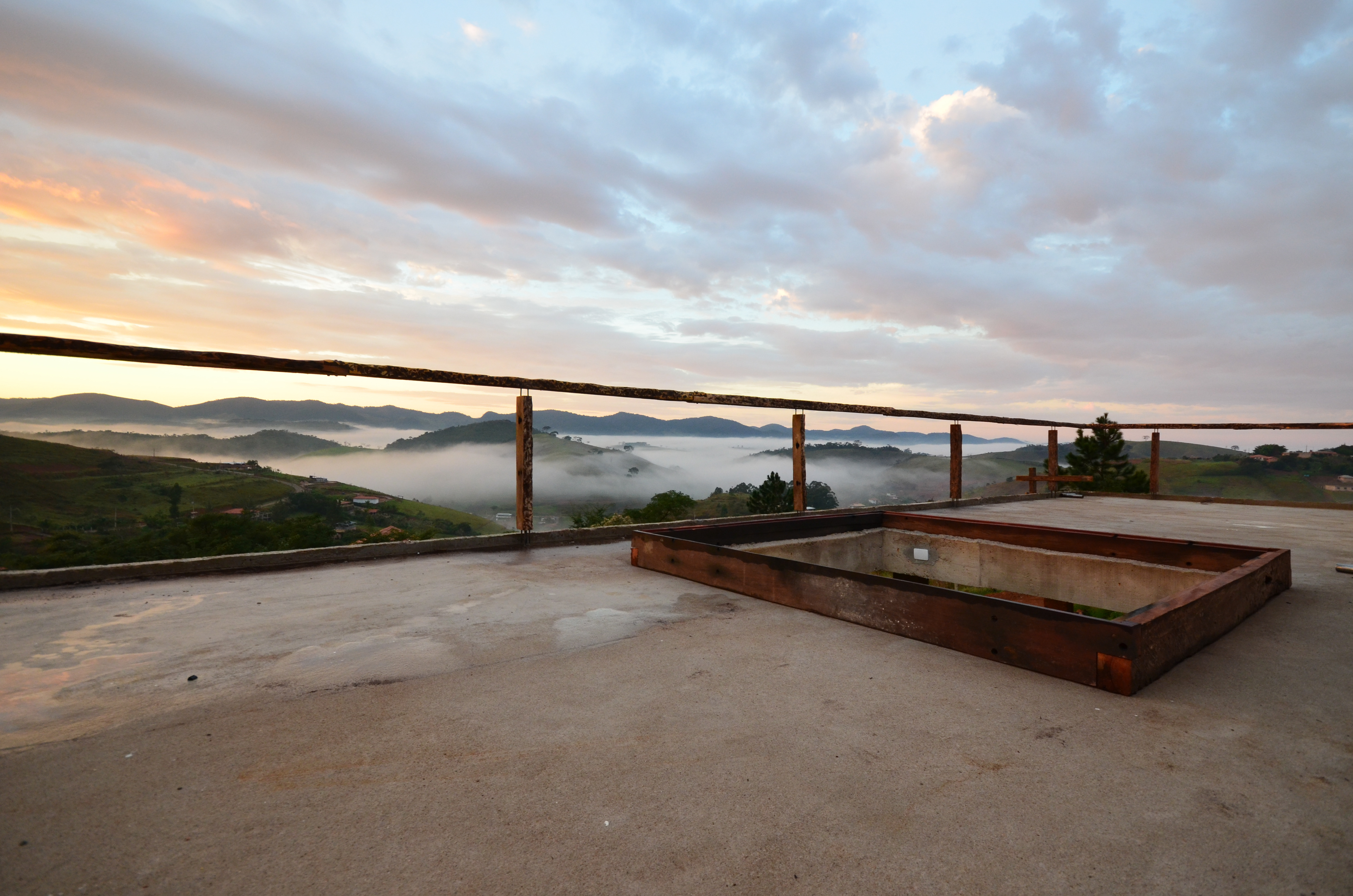 Sobre tabuados de jequitibá dois tetos distintos foram construídos: telhado para a casa e laje a gerar sua dupla extensão: varanda e terraço - espaços intermediários entre a casa e a imensidão.