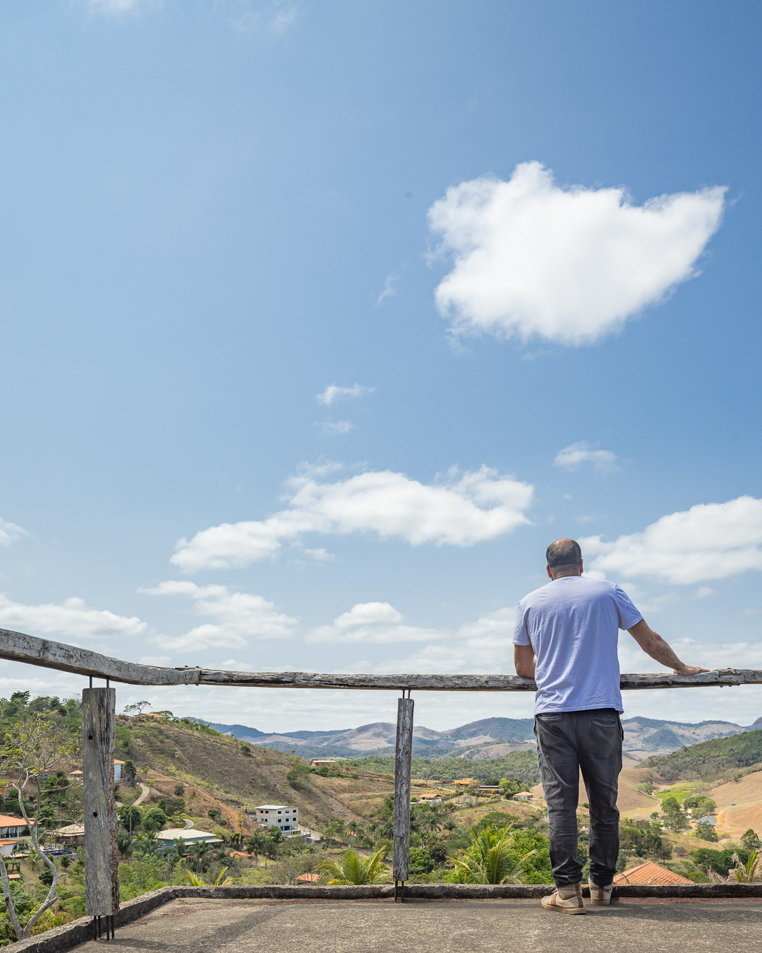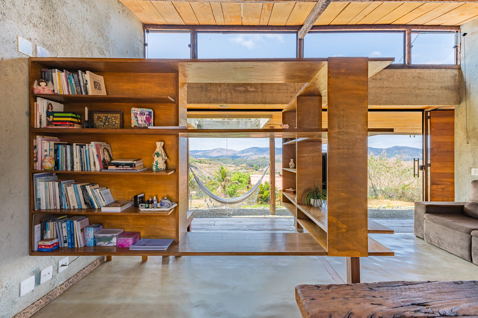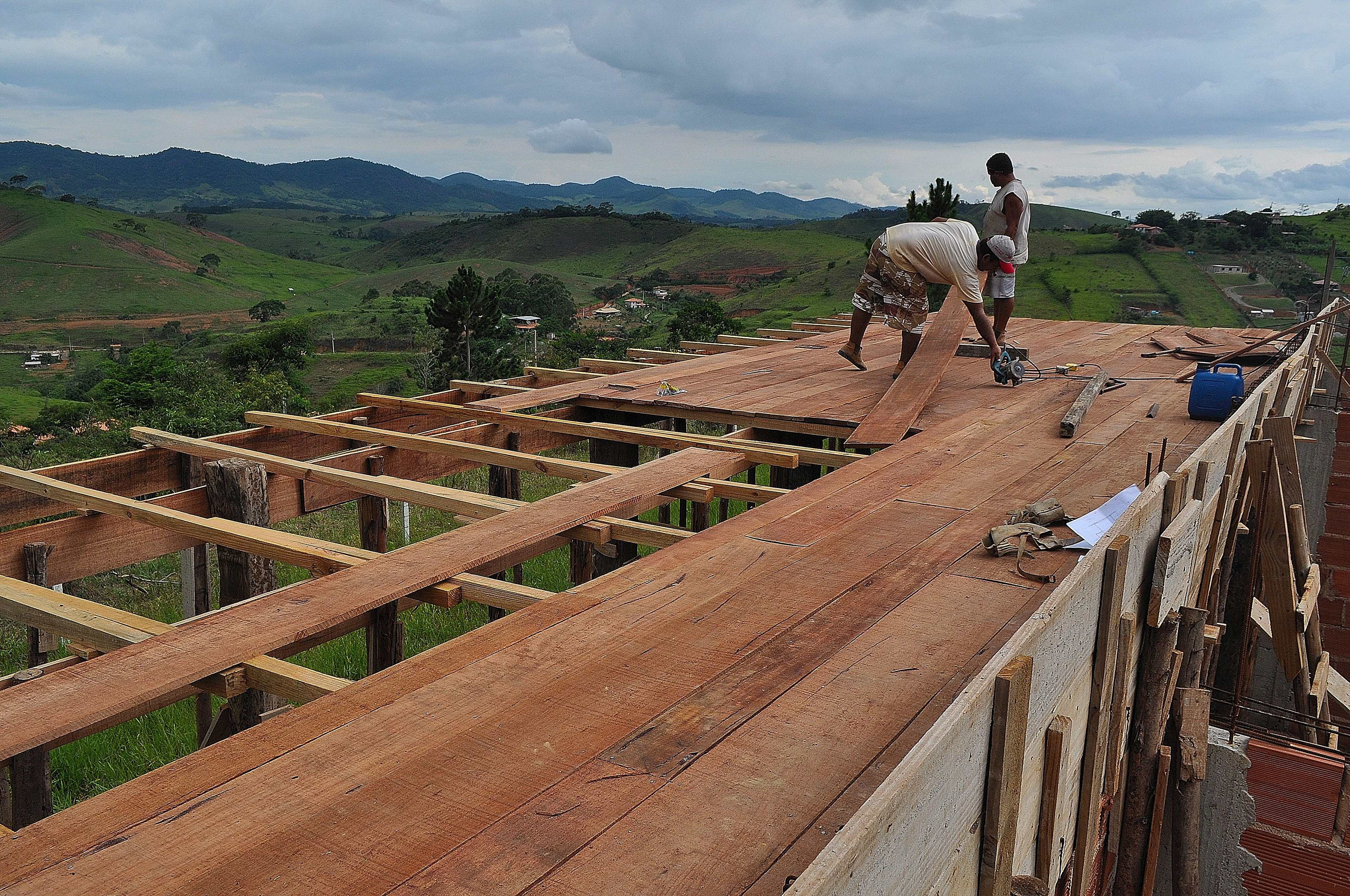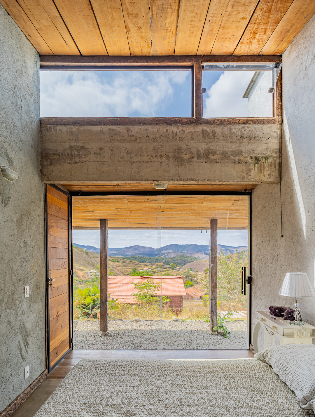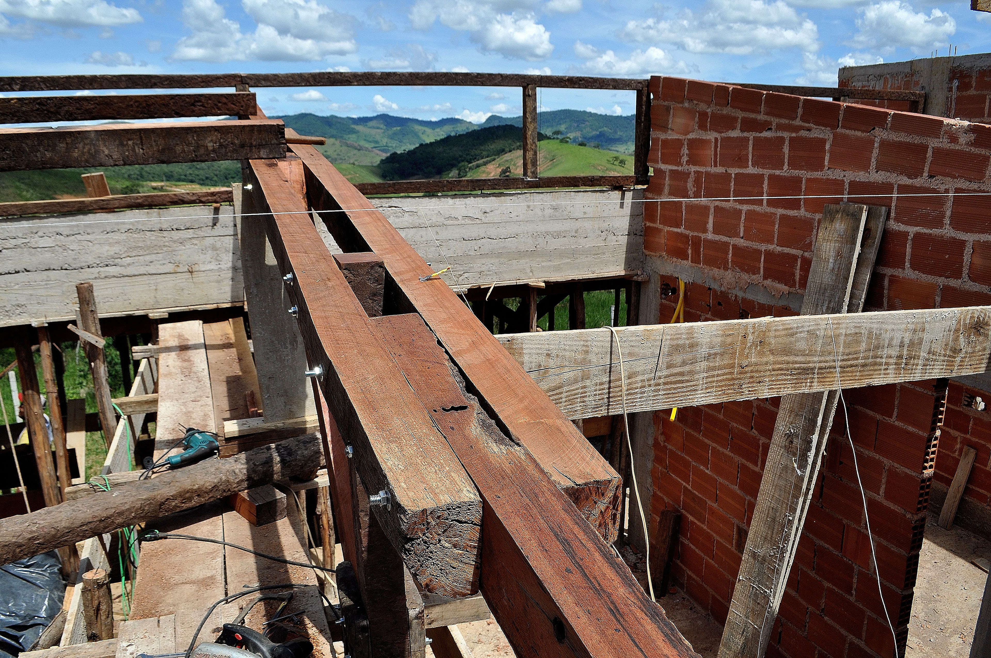 Sobre tabuados de jequitibá dois tetos distintos foram construídos: telhado para a casa e laje a gerar sua dupla extensão: varanda e terraço - espaços intermediários entre a casa e a imensidão.