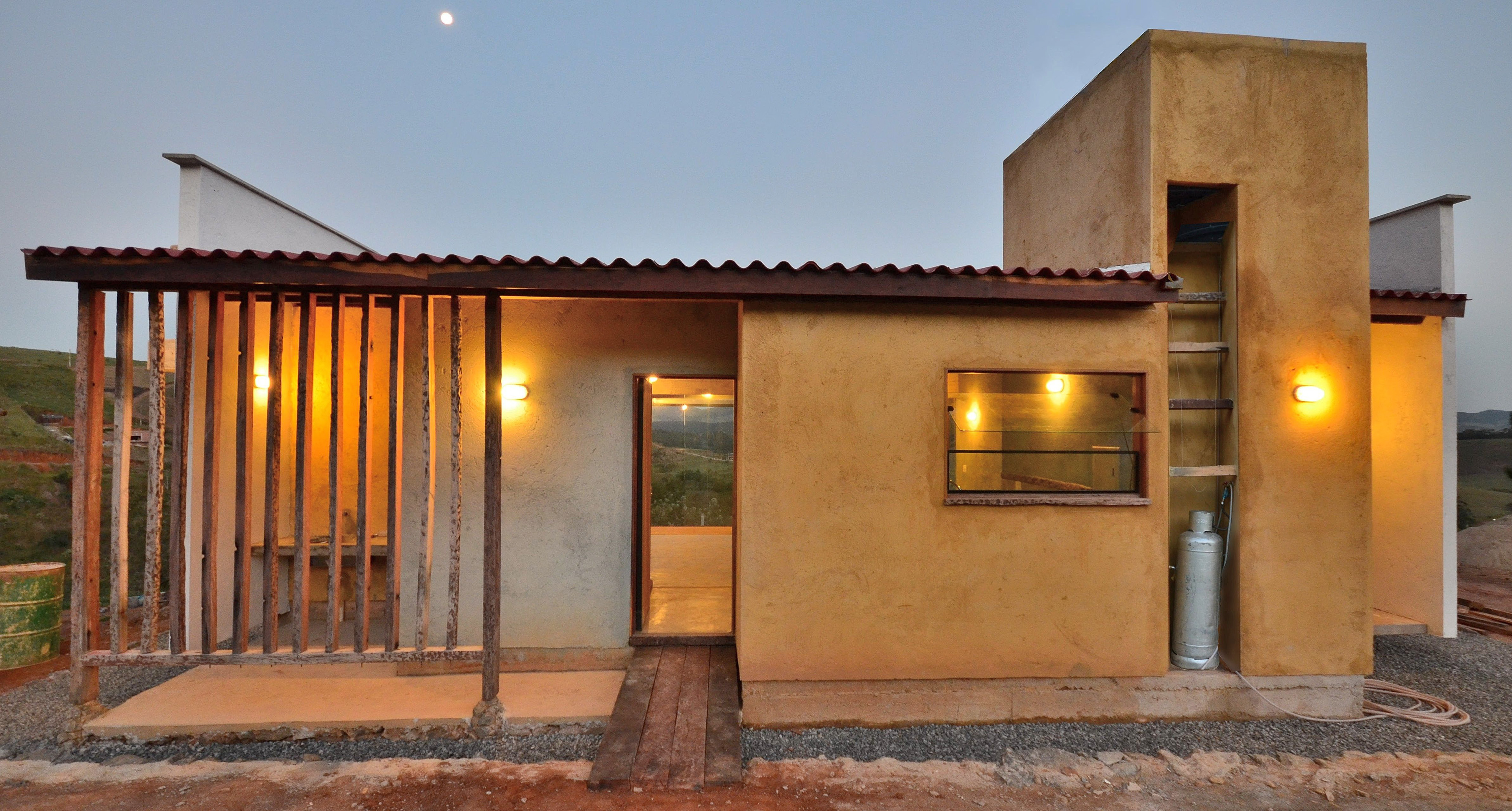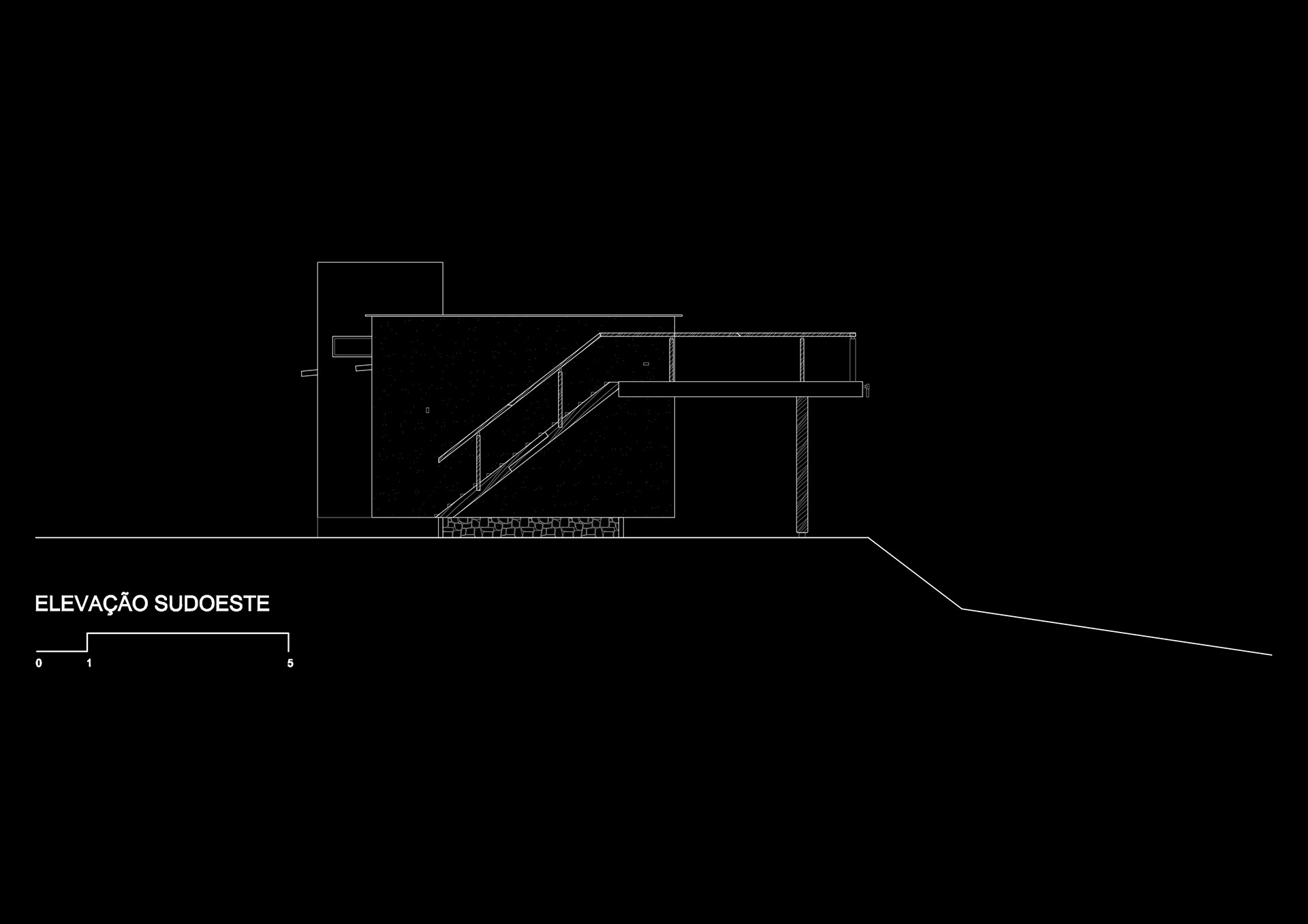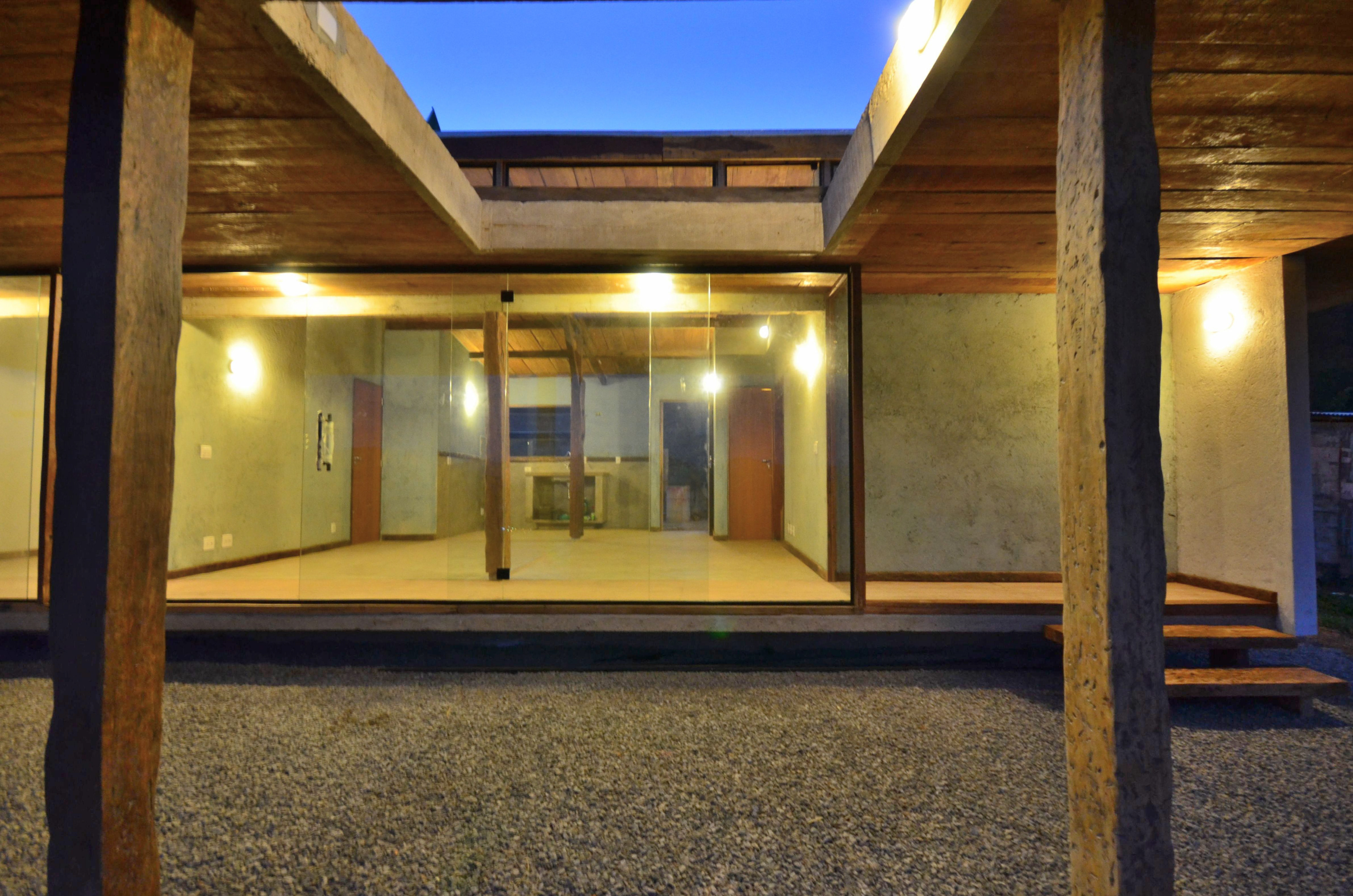 As estruturas em madeira foram desdobradas de dormente ferroviário reaproveitado e permitiram a montagem com mão de obra do local. O desenho se organiza a partir de quatro módulos de 2,80m - medida determinada pelo comprimento do dormente. Assim, pequenos espaços servidores são agrupados como uma barreira térmica do sol noroeste em proteção aos espaços servidos. A face sudeste fica, assim, liberada para instalação de 30m² de vidro frente ao sol nascente e ao panorama de morros.