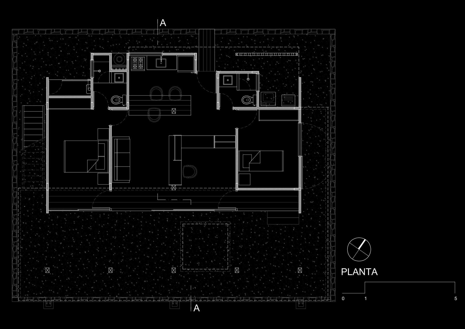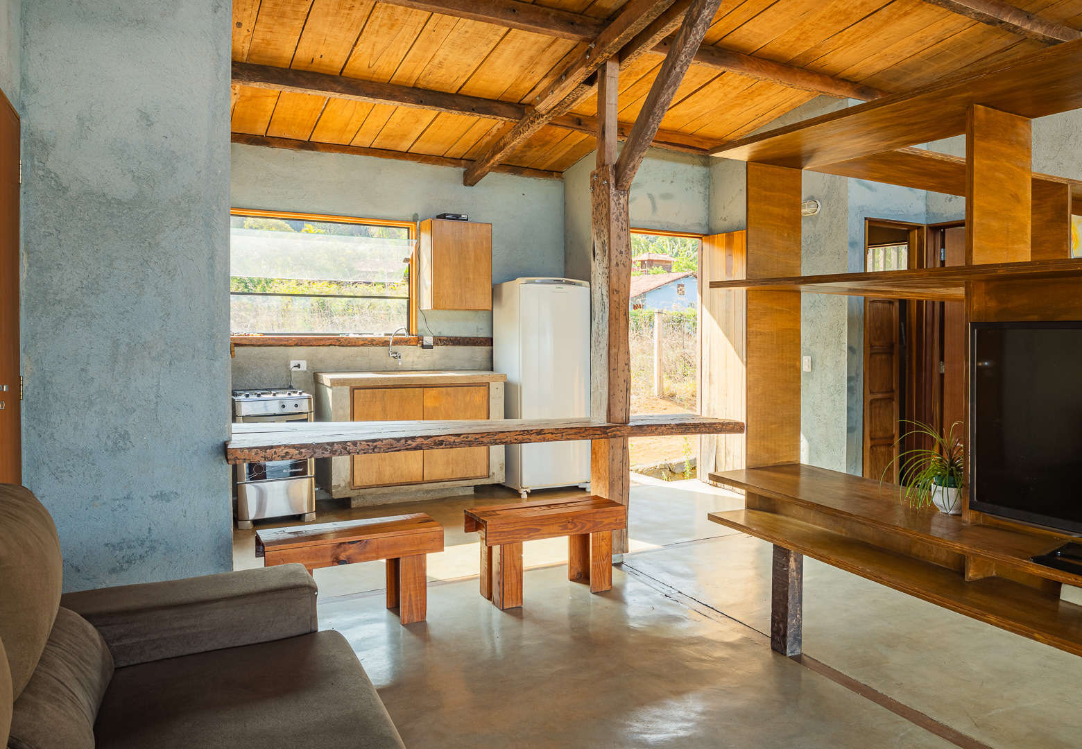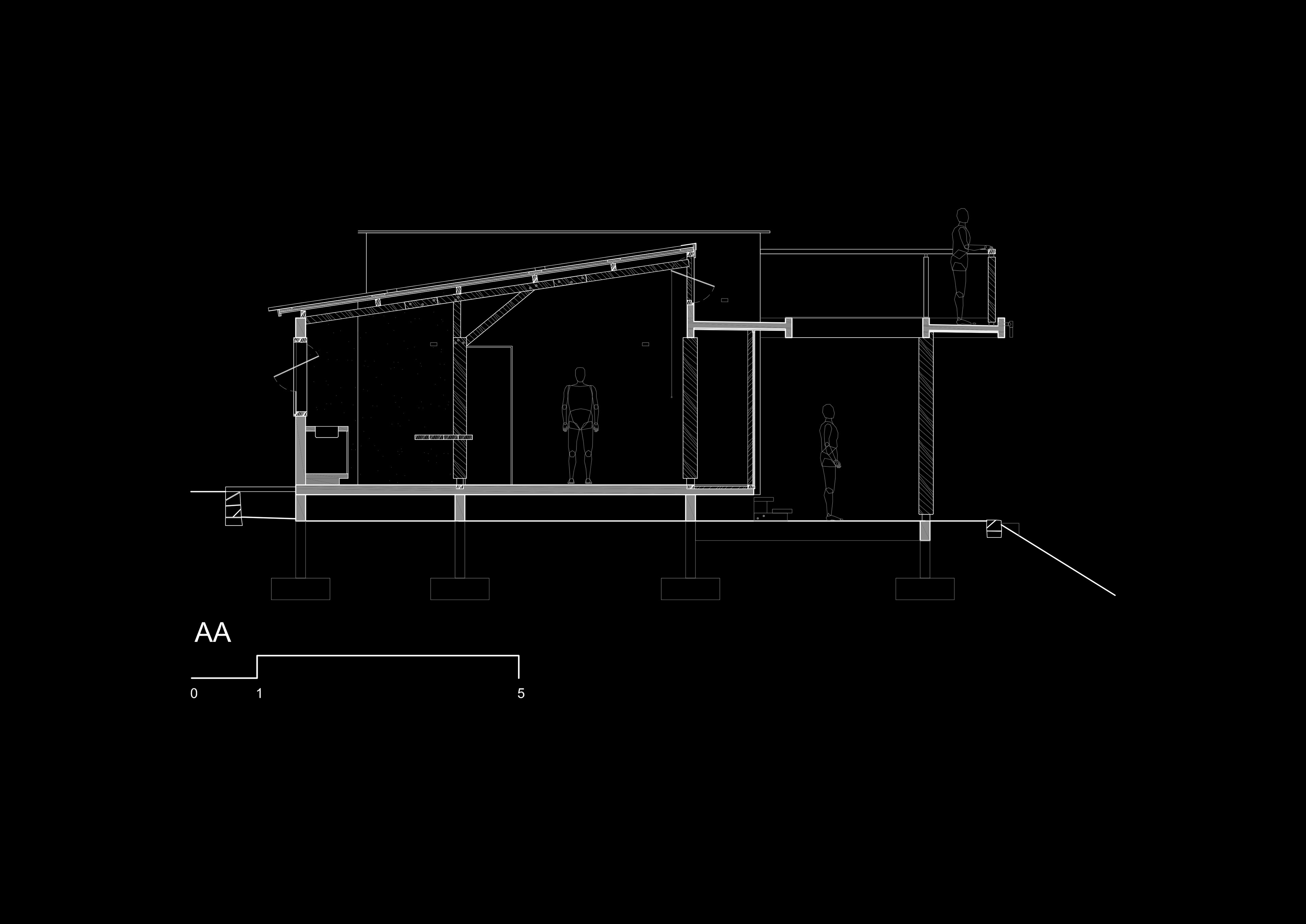 As estruturas em madeira foram desdobradas de dormente ferroviário reaproveitado e permitiram a montagem com mão de obra do local. O desenho se organiza a partir de quatro módulos de 2,80m - medida determinada pelo comprimento do dormente. Assim, pequenos espaços servidores são agrupados como uma barreira térmica do sol noroeste em proteção aos espaços servidos. A face sudeste fica, assim, liberada para instalação de 30m² de vidro frente ao sol nascente e ao panorama de morros.