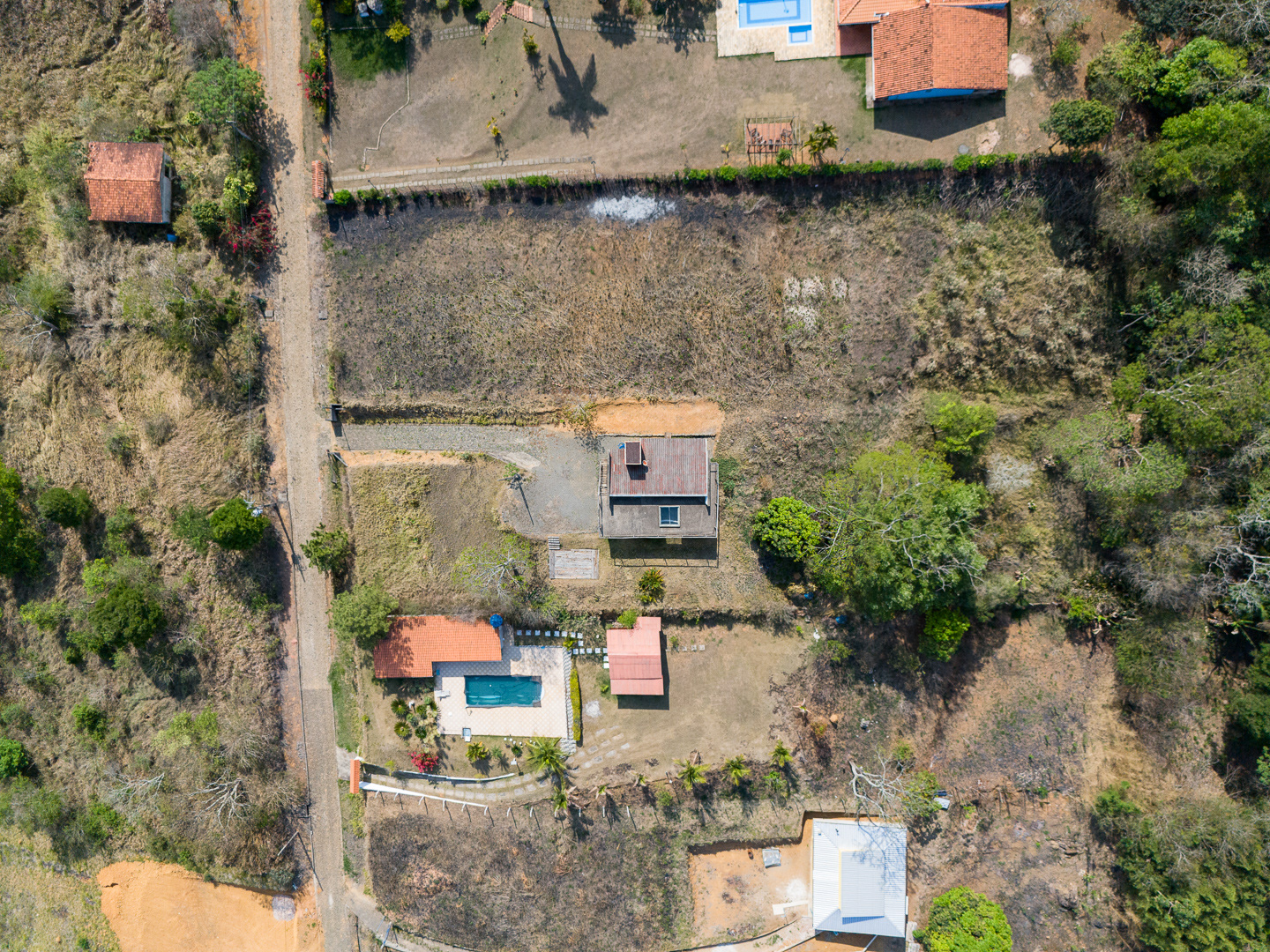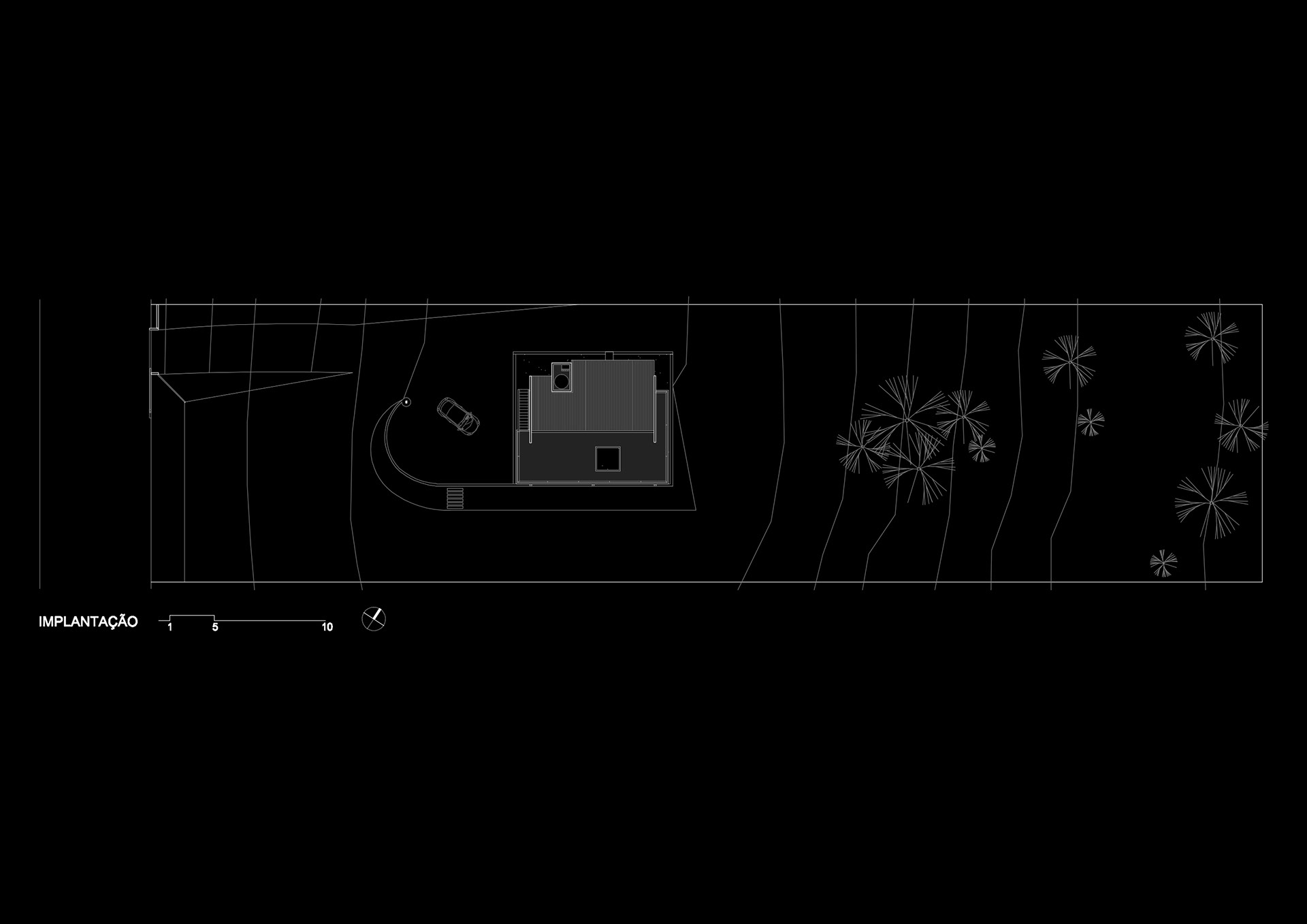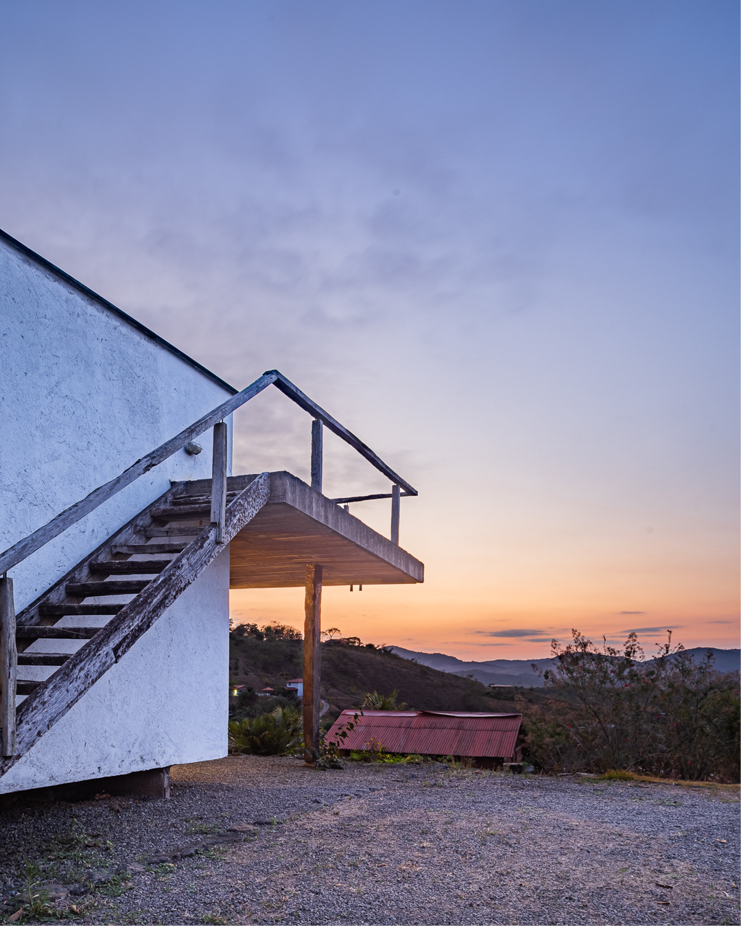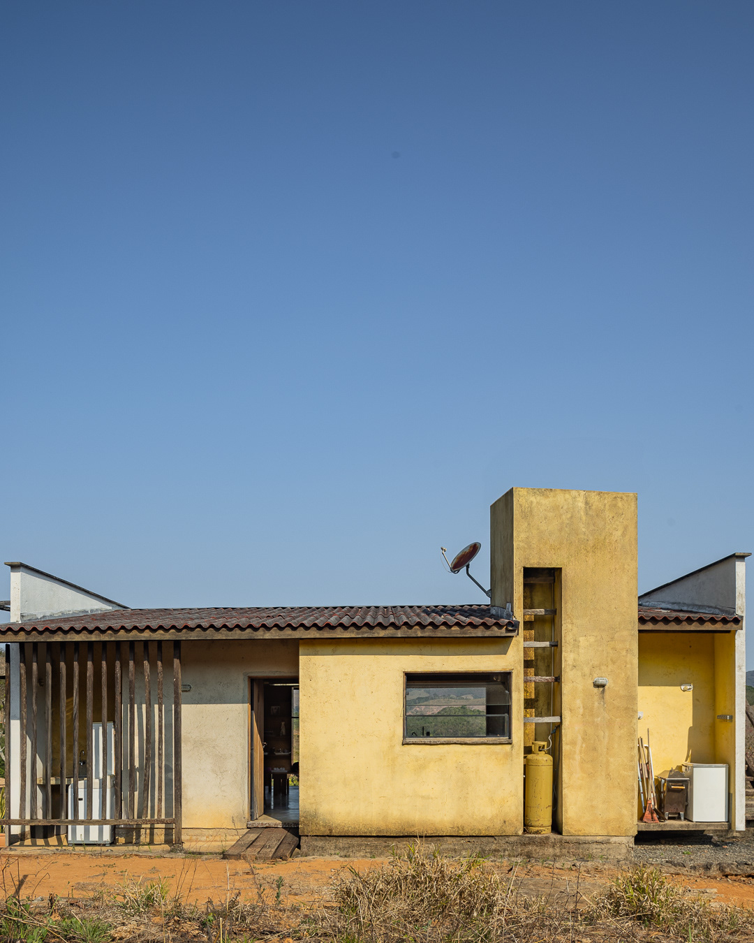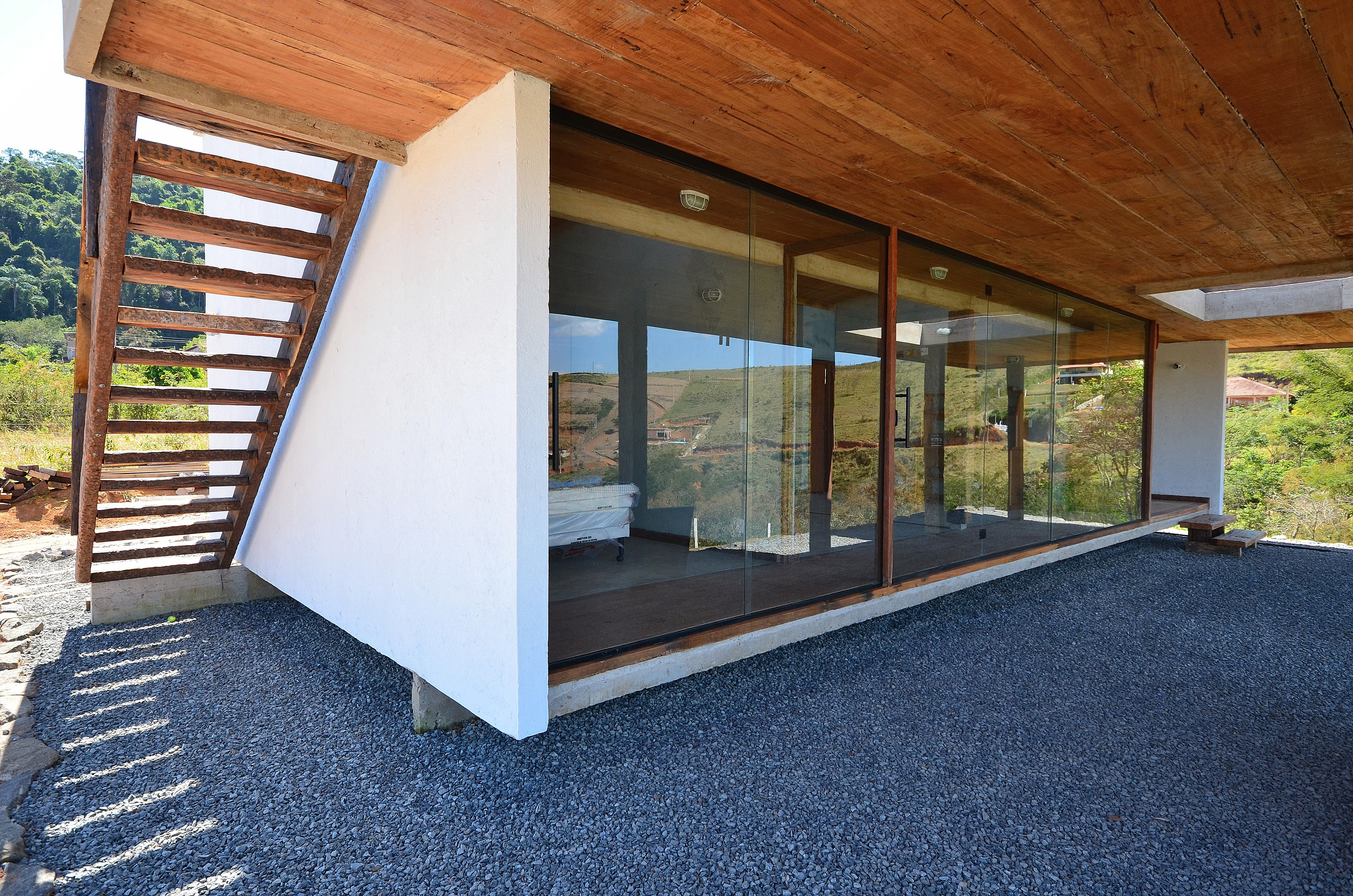A casa ocupa o topo de uma faixa de terra situada numa colina a 10km do perímetro urbano de Matias Barbosa em Minas Gerais. Ela é um pequeno pavilhão de 70m² prolongado em mais 70m² de varanda e terraço. Sua laje de piso está elevada a 40cm do solo pelos baldrames aflorados e com elevação de suas empenas laterais, permite um fechamento de pedras secas